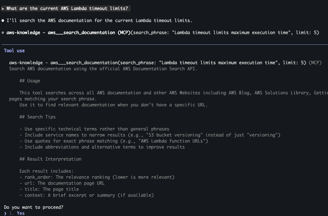 And when you proceed, you should get the answer directly coming from the AWS MCP Server: