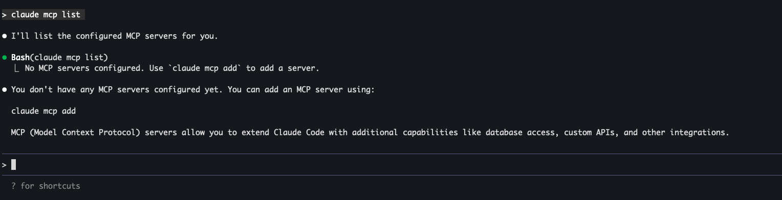 Before you start, to get a baseline, run the following command to see what MCP servers you have configured. By default you shouldn’t see anything.