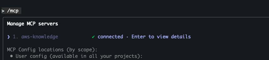 aws-knowledge: https://knowledge-mcp.global.api.aws (HTTP) - ✓ Connected